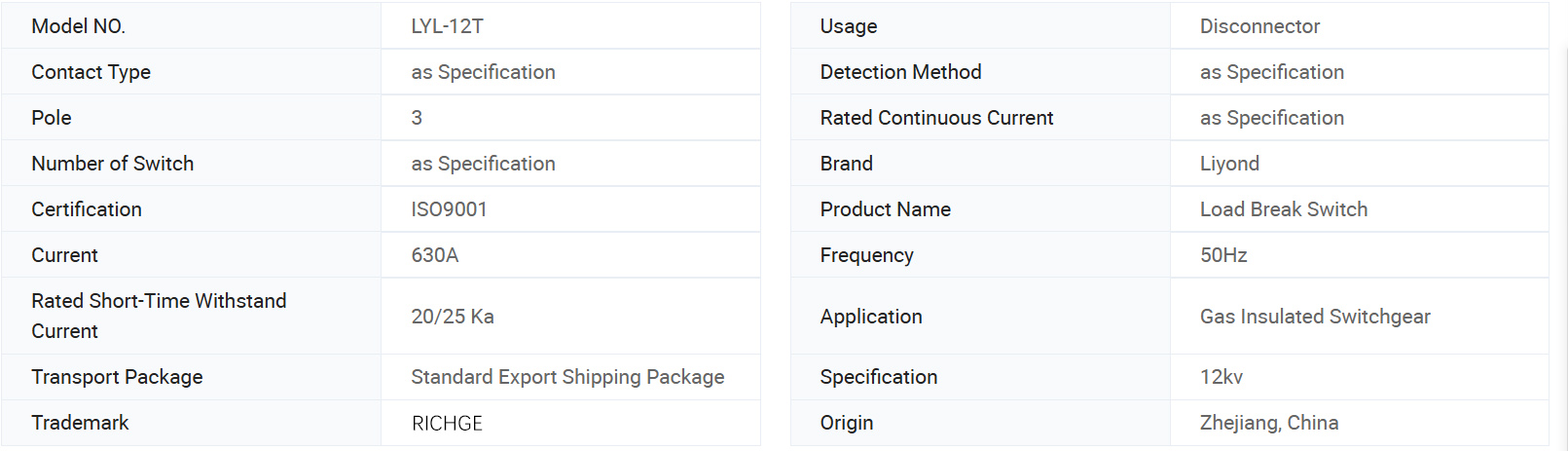 L'interruttore di carico LYL-12T è conforme ai requisiti pertinenti di GB3804-2004 "3,6 kV ~ 40,5 kV interruttore di carico ad alta tensione" e GB16926-1997 "APPLICAZIONE COMBINAZIONE SWITCH-FUSE-FUSE FUSE".