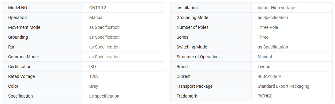 I sezionatori ad alta tensione per interni serie GN19-12, 12C (di seguito denominati sezionatori) sono dispositivi per interni con una tensione nominale di 12 kV, CA trifase 60 Hz e vengono utilizzati per dividere e chiudere circuiti in presenza di tensione e senza carico.