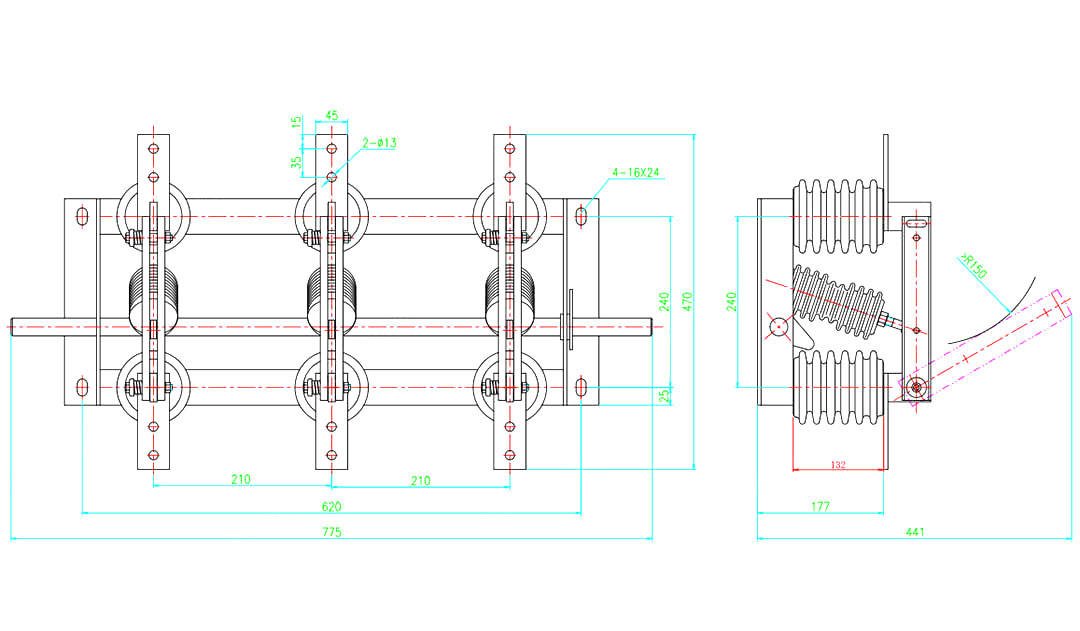 La parte conduttiva di GN19-12/400, 630, 1000, 1250 interruttore di disconnessione di tipo è fissata sulla base da due isolanti di pilastro per ciascuna fase. (GN19-12C/400, 630, 1000, 1250 Tipo ha un isolante per pilastro e un isolante involucro in porcellana.) Le tre fasi sono installate in parallelo e la parte conduttiva è costituita da contatti statici di coltelli da contatto e titolari di contatto (o aste conduttive). Ogni fase del coltello da contatto è collegata al centro dell'isolante della cravatta, isolante per cravatta e installata sulla base del mandrino collegato. Il mandrino è collegato all'asta di collegamento (fornito dall'utente) e tipo CS6-1 di meccanismo di spostamento attraverso la maniglia. Il coltello da contatto in collegamento è composto da due piastre di rame scanalato, che non solo aumenta l'area di dissipazione del calore del coltello a contatto per ridurre la temperatura inferiore, ma migliora anche la resistenza meccanica del coltello a contatto, in modo che la stabilità dinamica dell'interruttore sia migliorata. Un'estremità del coltello da contatto è montata sul blocco di contatto (o sull'asta conduttiva) da un bullone (auto di shaw). GN19-12/1000, 1250 a contatto con l'installazione della piastra di bloccaggio magnetico, più lo scopo della piastra di bloccaggio magnetico è che quando una grande corrente di cortocircuito per migliorare il coltello da contatto con la scanalatura tra il | attrazione. GN19-12/400, 630 interruttori di disconnessione hanno un piccolo limite attraverso la corrente, quindi non è necessario aggiungere una piastra di bloccaggio magnetico.