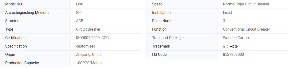 LW8-40.5, LW8A-40.5 Serie Solfur Gli interruttori di esafluoro di zolfo sono attrezzature elettriche ad alta tensione esterne AC 50Hz, adatte per il controllo e la protezione di 40.5kV di trasmissione e sistema di distribuzione, possono anche essere utilizzati per le banche di circuito aperto e vicino. Il prodotto può essere utilizzato con il meccanismo di molla CT14. L'interruttore di circuito è conforme allo standard National Standard GB1984-1989 AC ad alta tensione e alla International Electrotechnical Commission Standard IEC56, IEC6220-100 Interruttore AC ad alta tensione.