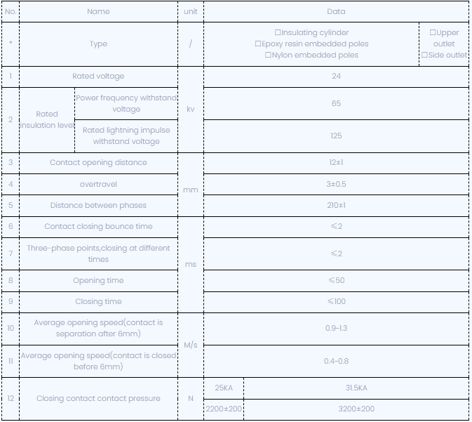 Il meccanismo di funzionamento del becher del circuito per vuoto di tipo VBI-24 viene utilizzato per l'energia di stoccaggio, che può essere gestito in due modi, manuale o elettrico. Le caratteristiche sono in conformità con GB1984-89, JB3855-96<10kv Indoor High Voltage Vacuum Circuit Breaker General Technical Specifications>, Disposizioni pertinenti dello standard IEC56.