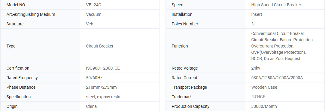 L'interruttore del vuoto di media tensione VBI-24 è una sorta di attrezzatura per interruttore di media tensione interna con tensione classificata a tre fasi AC 24KV da 50Hz/60Hz, che combinava la tecnologia della società ABB in Svizzera e sviluppata in Cina. Il prodotto è conforme allo standard GB1984 e IEC62271-100.