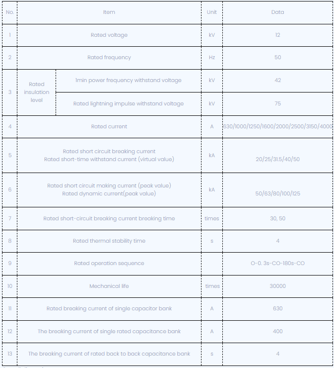 VSG-12 2000a Parametri tecnici dell'interruttore a vuoto