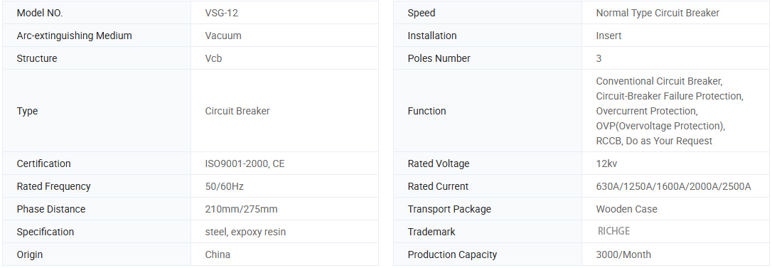 VSG-12 Tipo Interruttore a vuoto ad alta tensione interno utilizzata per l'energia di stoccaggio. Il meccanismo operativo può essere gestito in due modi, per funzionamento manuale ed elettromotivo, le caratteristiche sono secondo GB1984-2003 Interruttore AC ad alta tensione, JB3855-1996 3.6-4.5kV AC Ac Interruttore AC ad alta tensione e Interruttore AC ad alta tensione ad alta volta